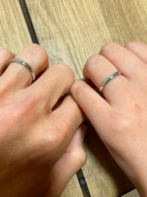 彼の指輪はプラチナで2.5㎜に幅アップでしたが、ずっしり重みがあってびっくりしました。私の指輪はピンクゴールド1.5㎜のピカピカ仕上げで、細くても存在感があってとても気に入りました(*^^*)