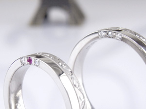 女性の方のリングは誕生石のルビーと左右に透明のダイヤモンド男性の方はムーストーンと左右に透明のダイヤモンドを留めています。