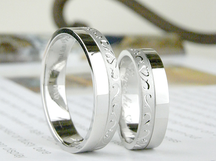 リング全体には、模様を入れています、唐草のような模様を全体に入れて反対面にはハートになるように仕上げています