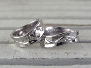 バラとハイビスカスの横にあるツタはお二人のリングを合わせたときハートになうように彫っています。