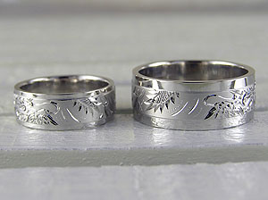 ツヤ消し加工と鏡面加工で作ったリングに手彫りでデザインしております